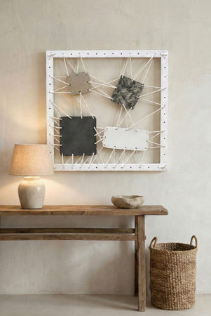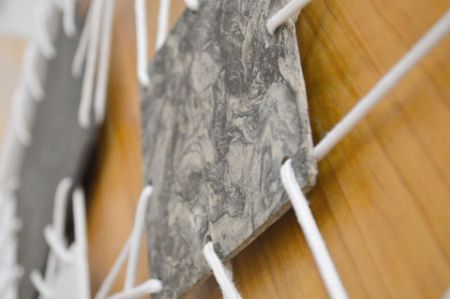 Cuatro placas cerámicas, distintas en textura, técnica y composición, se sostienen mediante cuerdas que las unen entre sí y al propio marco, generando un equilibrio visual entre las fuerzas que tiran hacia todas direcciones y que, en conjunto, se neutralizan . Cada pieza está hecha con una arcilla distinta, como un homenaje a la versatilidad del barro y sus infinitas posibilidades expresivas.